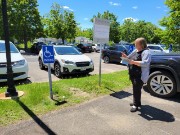 In preparation for local government elections in November, Elections New Brunswick is evaluating the accessibility of buildings it commonly rents as polling stations and returning offices during elections. A team of returning officers will travel the province this month, assessing the buildings and ranking them on various accessibility standards. In photo, Municipal Returning Officer Patti Nason counts and records the number of designated parking spaces for persons with a disability during a training exercise held in Fredericton on Tuesday.