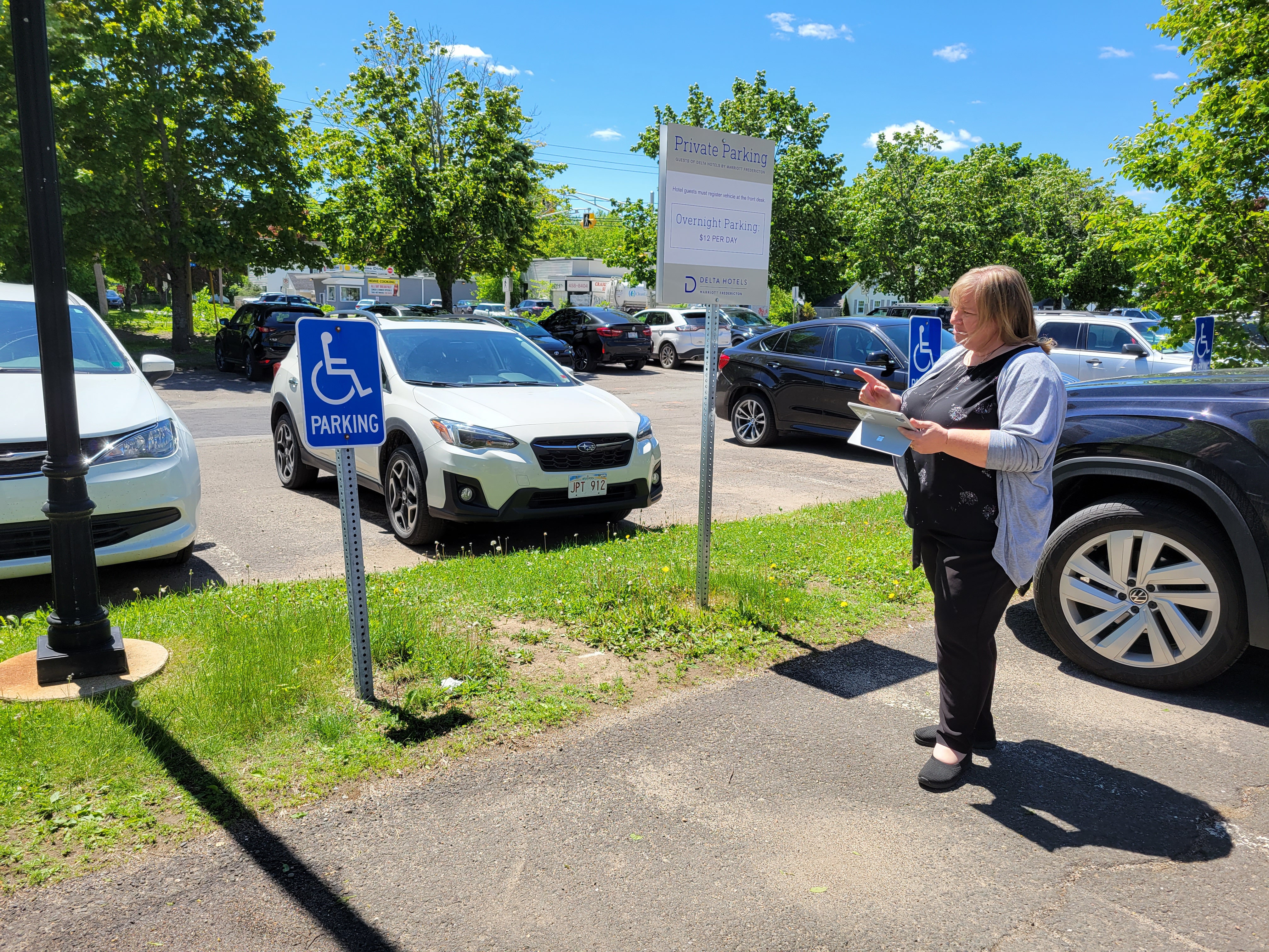 In preparation for local government elections in November, Elections New Brunswick is evaluating the accessibility of buildings it commonly rents as polling stations and returning offices during elections. A team of returning officers will travel the province this month, assessing the buildings and ranking them on various accessibility standards. In photo, Municipal Returning Officer Patti Nason counts and records the number of designated parking spaces for persons with a disability during a training exercise held in Fredericton on Tuesday.